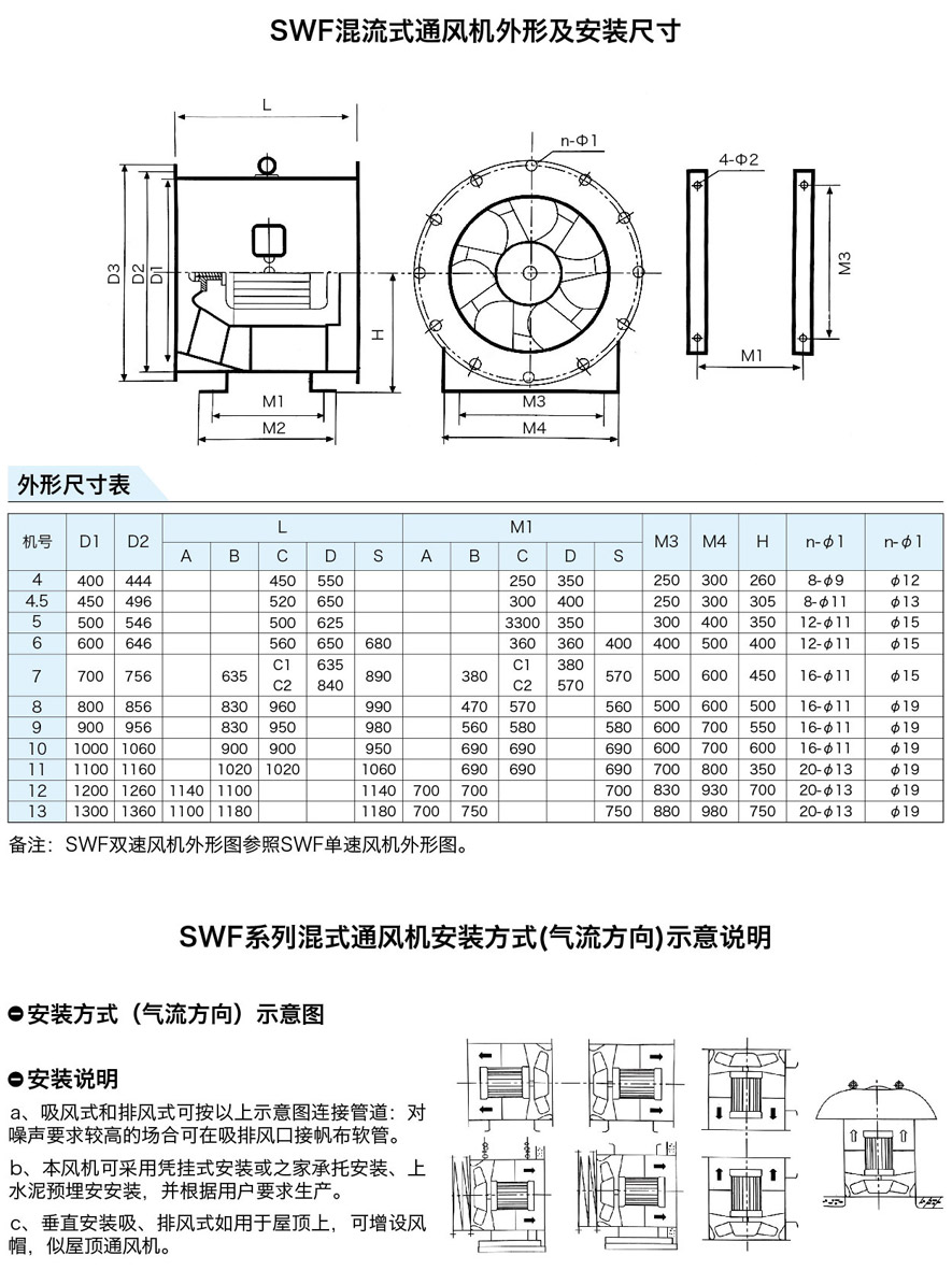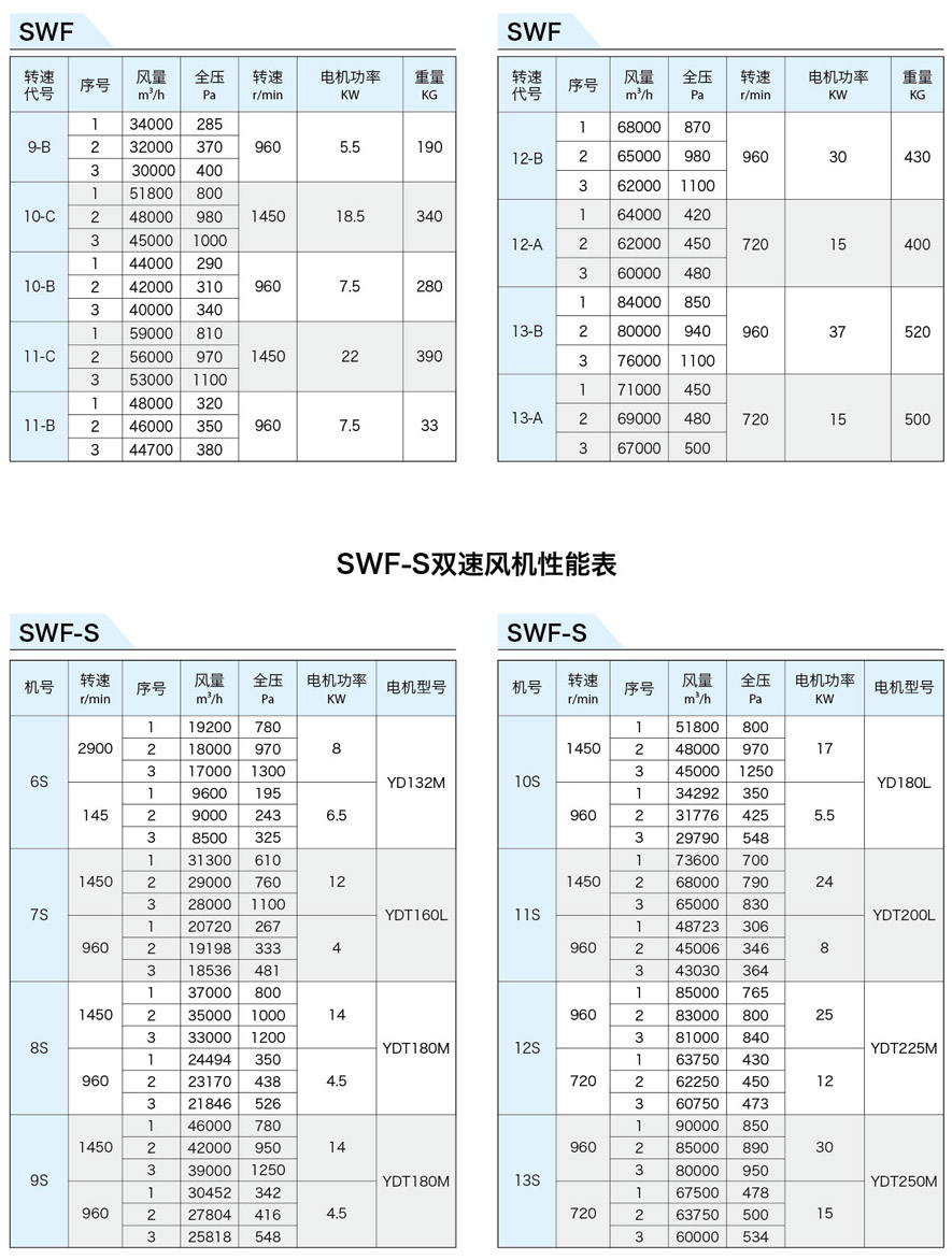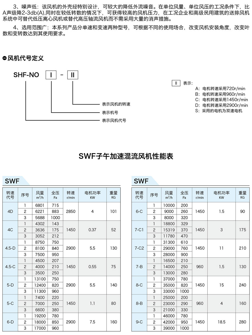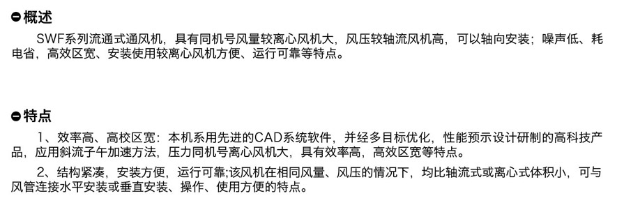 SWF系列流通式通風(fēng)機(jī),具有同機(jī)號風(fēng)置較離心風(fēng)機(jī)大,風(fēng)壓較軸流風(fēng)機(jī)高,可以軸向安裝; 噪聲低、耗 電省,高效區(qū)寬、安裝使用較離心風(fēng)機(jī)方便、運(yùn)行可靠等特點(diǎn)。