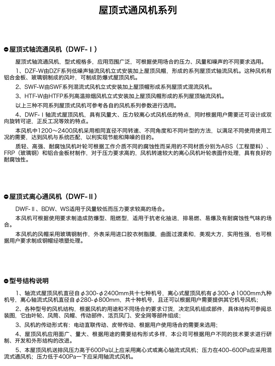 屋頂式軸流通風(fēng)機,型式規(guī)格多,應(yīng)用范圍廣泛,可根據(jù)使用場合的壓力、風(fēng)置和噪聲的不同要求選用。 DWF-I軸流式屋頂風(fēng)機,具有風(fēng)置大、壓力較離心式風(fēng)機低的特點,同時根據(jù)用戶需要還可設(shè)計成雙 向旋轉(zhuǎn)可逆,正反工況等效的特點。