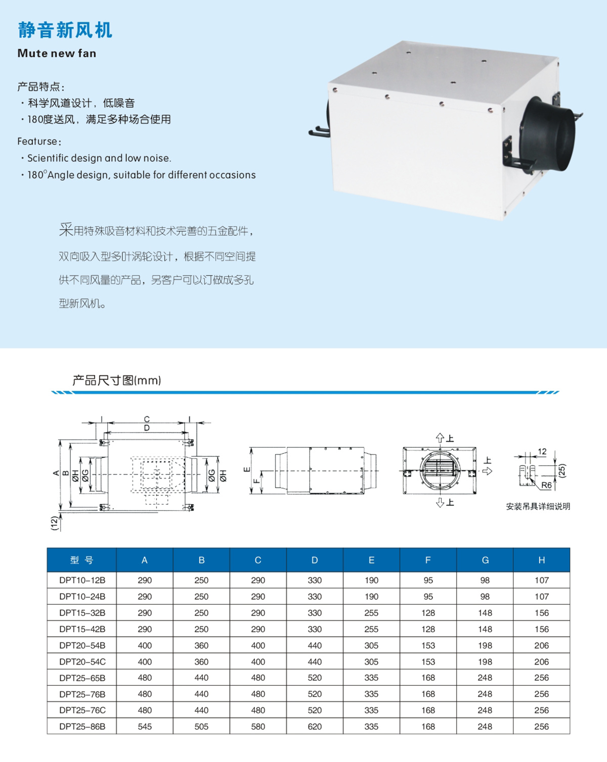 ?科學風道設(shè)計,低噪音 ?180度送風,滿足多種場合使用 用特殊吸音材料和技術(shù)完善的五金配件, 雙向吸入型多葉滿輪設(shè)計,根據(jù)不同空間提供不同風量的產(chǎn)品,另客戶可以〇做成多孔型新風機。